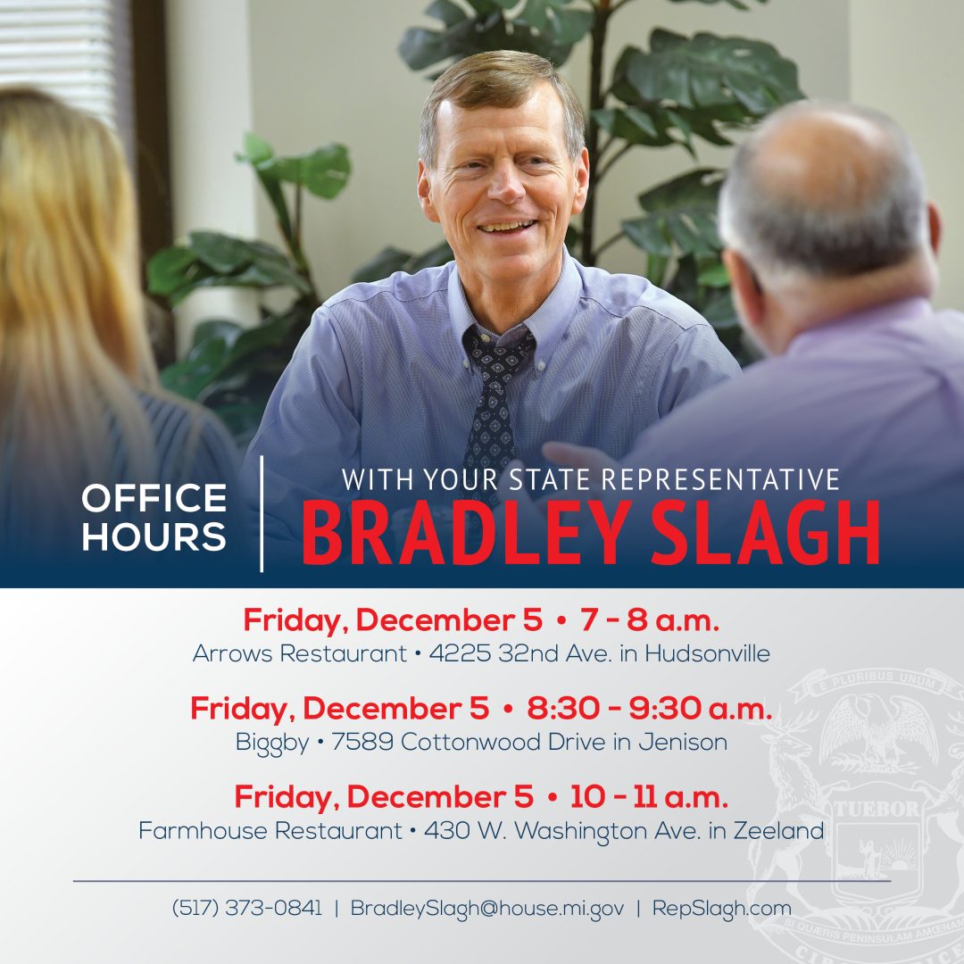 State Rep. Bradley Slagh, of Zeeland, will be available for local conversation during his morning office hours in Hudsonville, Jenison, and Zeeland on Friday, Dec. 5.