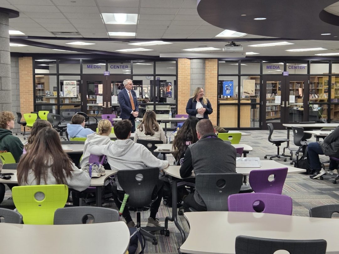 PHOTO INFORMATION: State Rep. Jamie Thompson, of Brownstown, speaks with students at Woodhaven High School on Tuesday, April 7. Thompson was joined by state Rep. Mark Tisdel as they discussed their roles as state legislators, the process of introducing bills and how they become laws, and a new law regarding student cellphone use during instruction time that is set to begin with the 2026-27 school year.